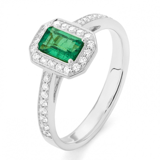 Anillo de oro blanco de 18K con esmeralda verde en talla octogonal de 0,90 cts y 34 diamantes blancos en talla brillante de 0,35 cts